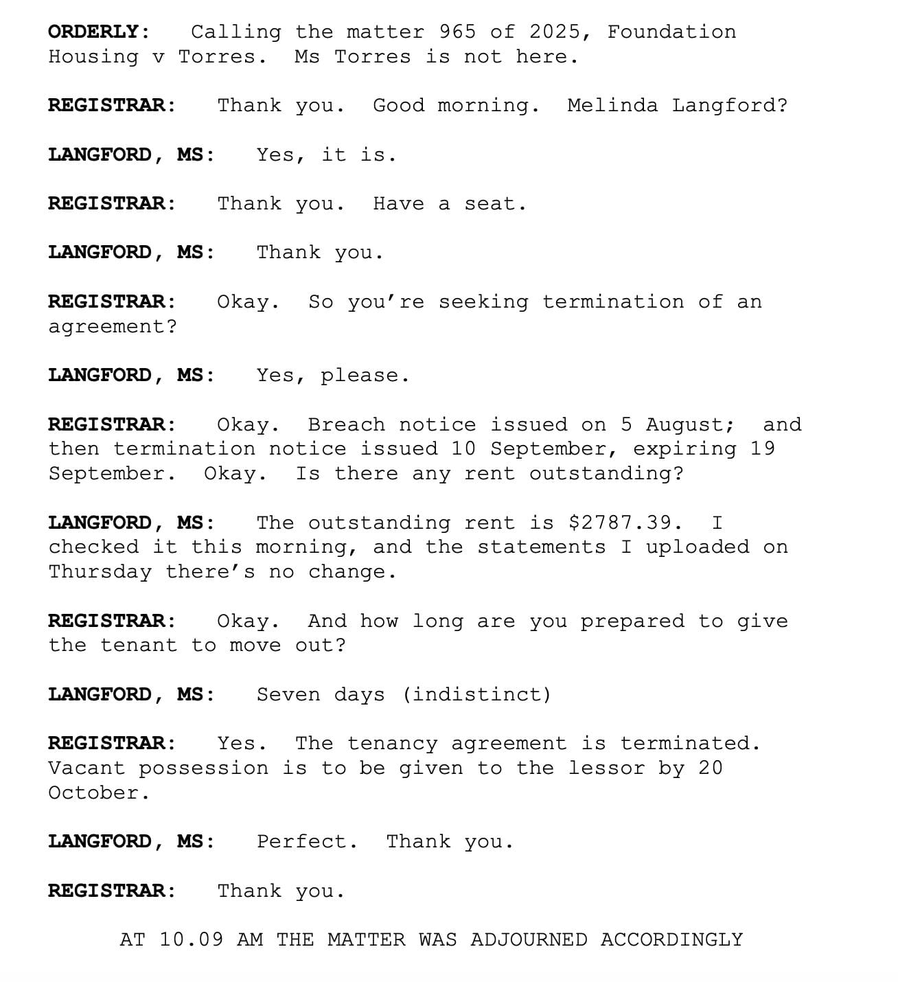 I’ve seen the transcripts of each of the three hearings. The first, the hearing where Nicola’s tenancy was terminated, is copied below in its entirety. Nicola says she turned up to court late, by which time the court order had been made by a registrar - not a magistrate, but a court official who does not require a legal degree - in her absence. The hearing lasted one minute. Nicola immediately appealed the same day.