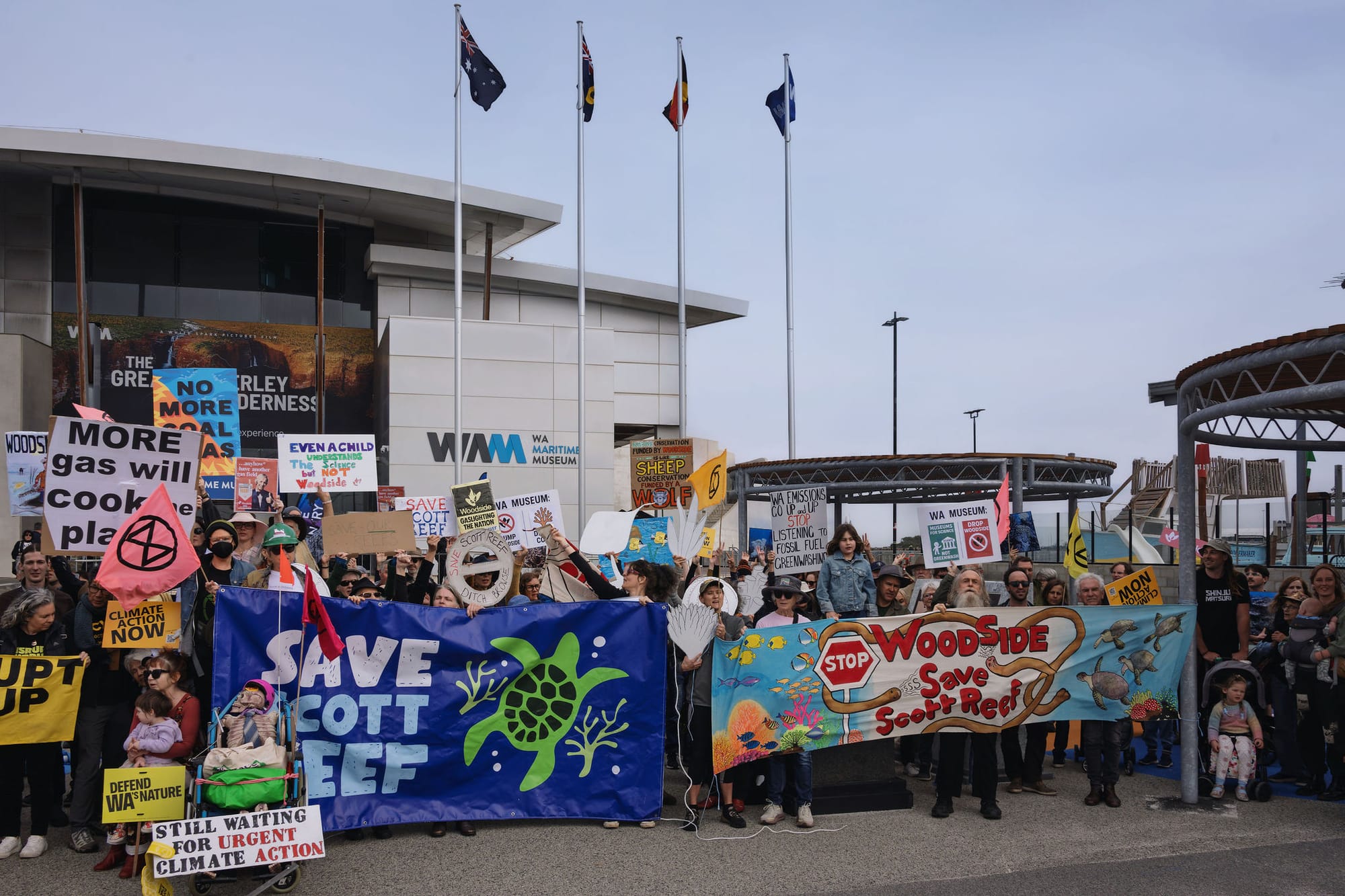 On Sunday morning, attendees were outnumbered by protestors outraged about Woodside’s use of the WA Museum to whitewash their brand at a time when heating waters driven by fossil fuel extraction have whitewashed coral along 1500kms of WA’s coast.