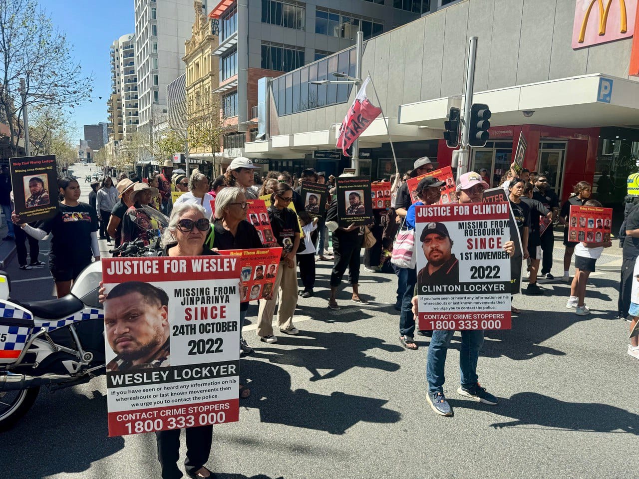 During the court’s lunch break, as I left the David Malcolm Justice Centre where the hearing was taking place, I heard chanting and saw police on motorbikes stopping traffic. A protest march was approaching, made up largely of First Nations people, some holding placards bearing photos of Aboriginal men who’d gone missing in missing years. The protesters were calling for the state government to invest more effort into unsolved missing person cases in WA’s north.