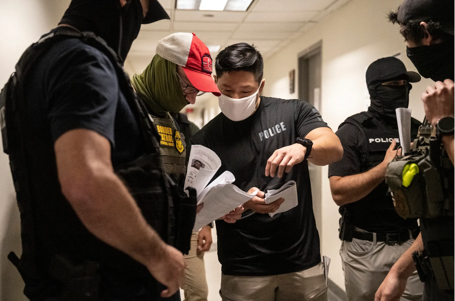 “No loitering,” an agent barked at us as we walked past their little checkpoint near the lift. Two other officers followed us down the corridor. For probably the most powerful agency in the entire US government at the moment, ICE agents look remarkably sloppy. They barely seem to have a uniform - some are in casual clothes, others are wearing vests, and their insignia looks like they screenprinted it at home onto a range of cheap t-shirts from Target.
